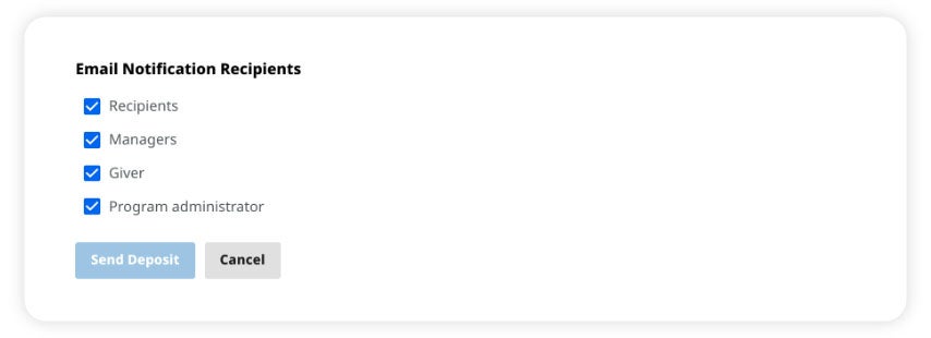 Group Deposits allows you to create meaningful, memorable recognition experiences for the entire company down to individual departments and everything in between. With minimal setup and no approvals needed, you can send recognition at scale quickly and easily for any size celebration.