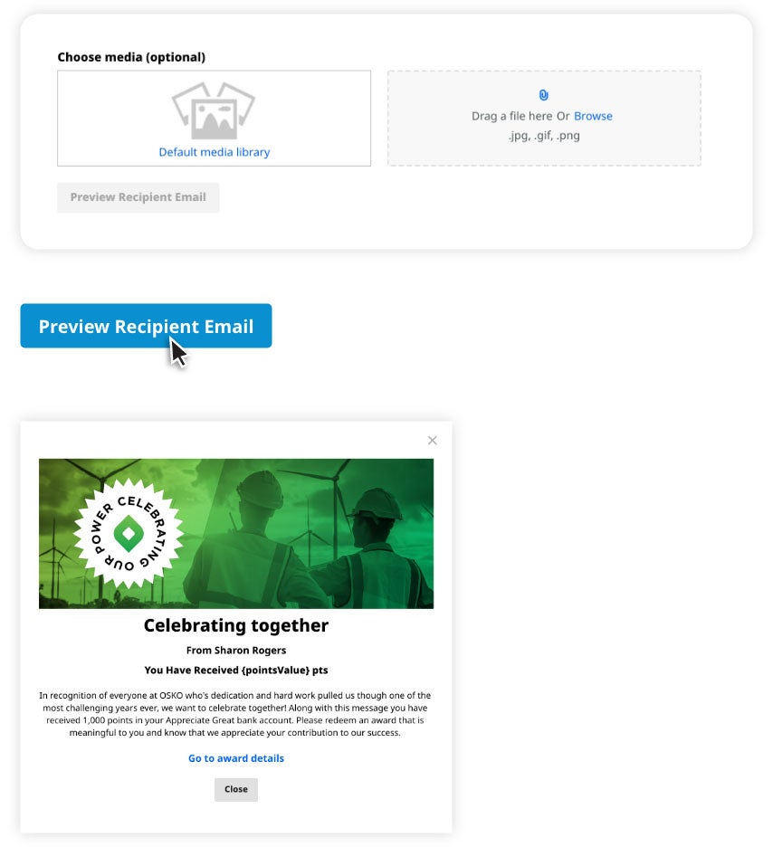 Attach your own image to be included in the email notification for the deposit or choose a gif, video, or eCard from the media library. Click Preview Recipient Email to see what the message will look like before sending.